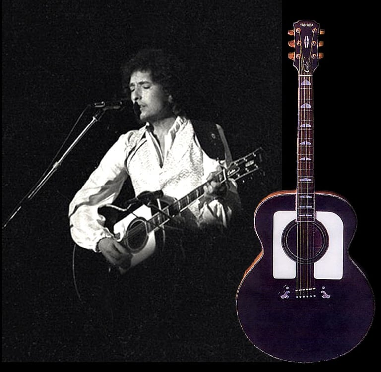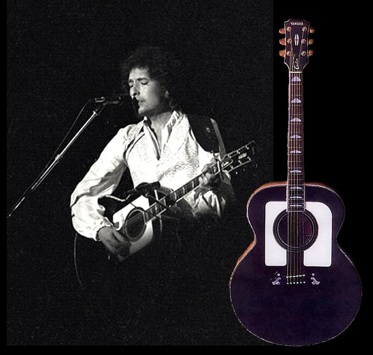 Dostępne zdjęcie: Bob Dylan na scenie w Budokan ze swoją czarną gitarą Yamaha L-52. Podczas słynnych koncertów w tokijskiej hali Budokan w 1978 roku, Bob Dylan odkrył gitary Yamaha i zakupił kilka modeli, które stały się jego głównymi instrumentami akustycznymi na scenie. Najczęściej widywano go z modelem L-6 oraz charakterystycznym, czarnym L-52 z białym, kwadratowym pickguardem. Wybór ten przez artystę o statusie Dylana był potężnym sygnałem dla całego muzycznego świata, że japońskie instrumenty osiągnęły poziom, który satysfakcjonuje najbardziej wymagających twórców.