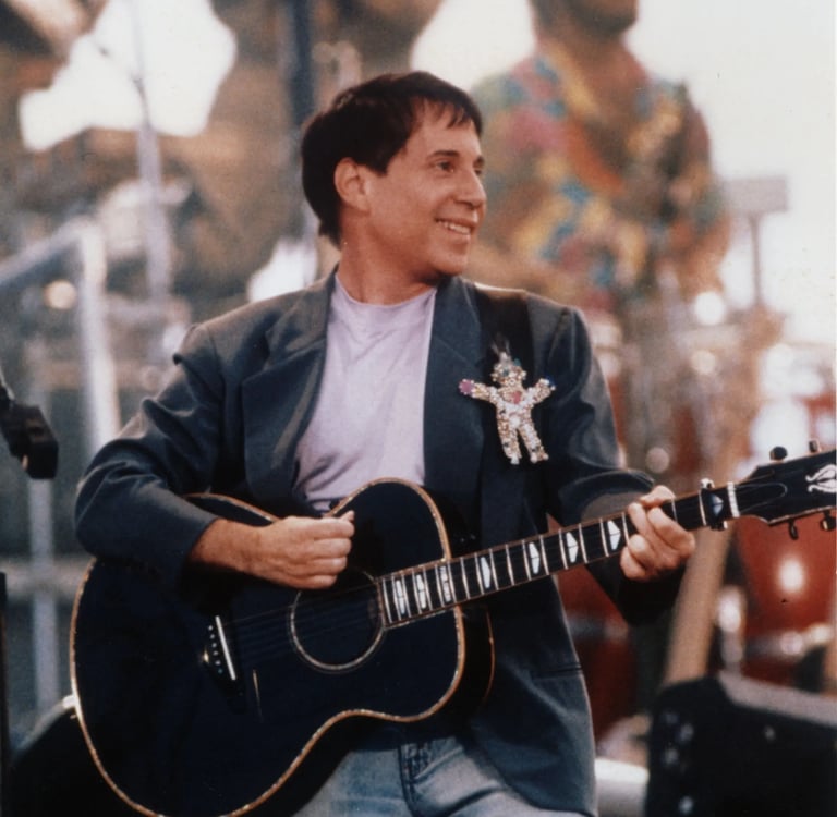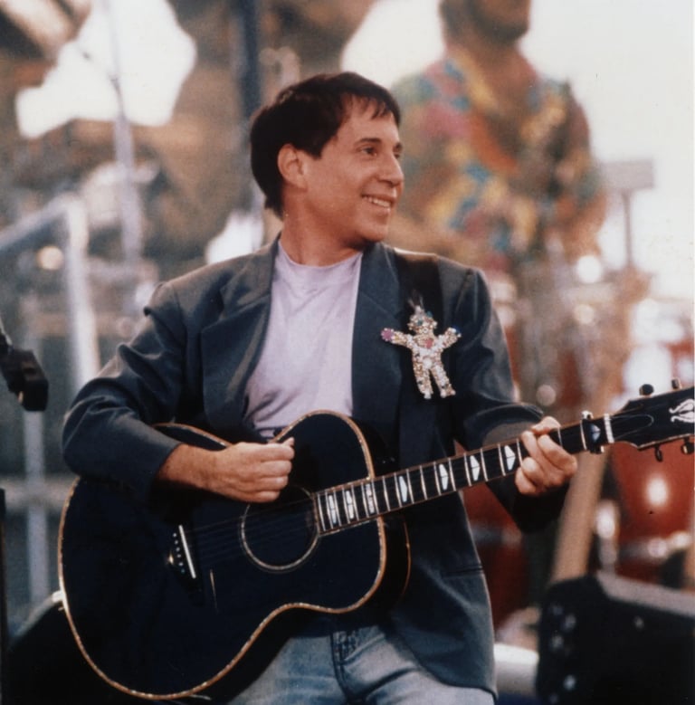 Dostępne zdjęcie: Paul Simon ze swoją charakterystyczną, czarną gitarą Yamaha custom. Długoletnia współpraca Paula Simona z custom shopem Yamahy, a w szczególności z lutnikiem Terumi Nakamoto, rozpoczęła się już w połowie lat 70.. Simon jest nierozerwalnie związany z serią swoich czarnych, customowych gitar akustycznych, bazujących na modelach takich jak LS400 czy pomniejszony CJ-52. Te instrumenty były jego podstawowym narzędziem pracy podczas najważniejszych występów, w tym legendarnego koncertu w Central Parku w 1991 roku, transmitowanego na cały świat.